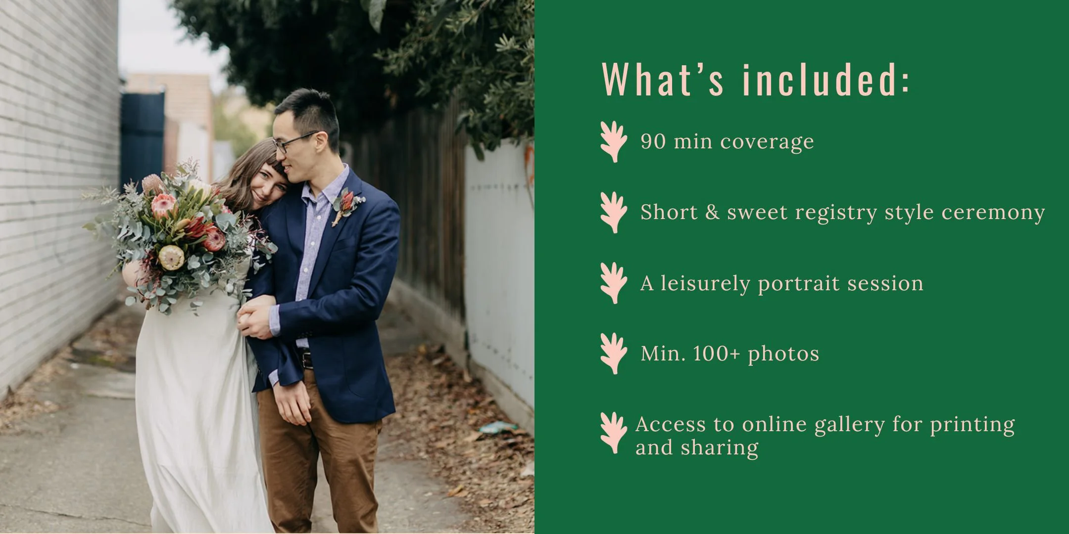 A warm, relaxed, totally legal but short and sweet ceremony delivered by Wendy, where you can exchange rings and personal vows (if you choose)